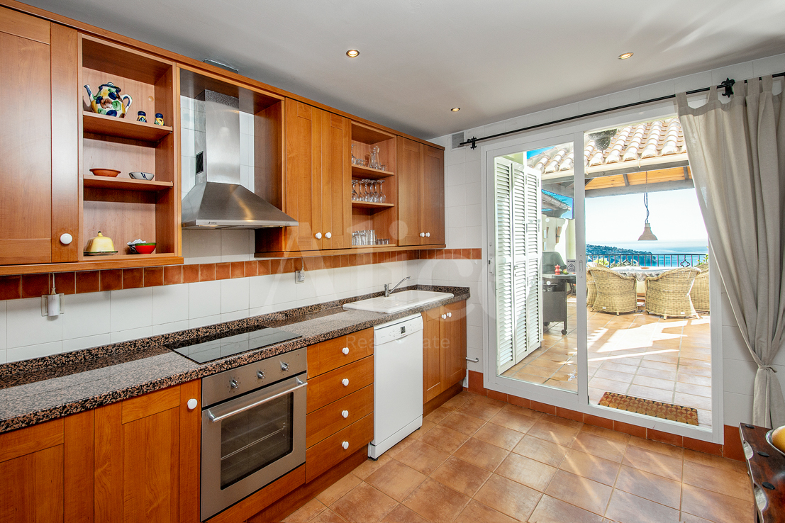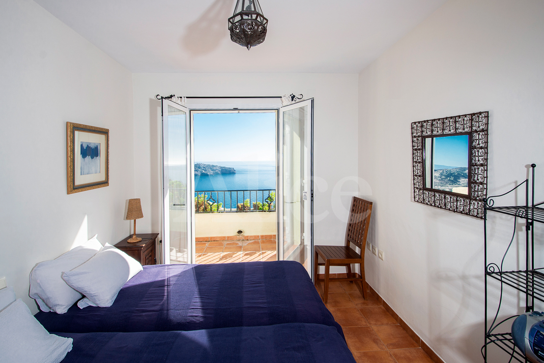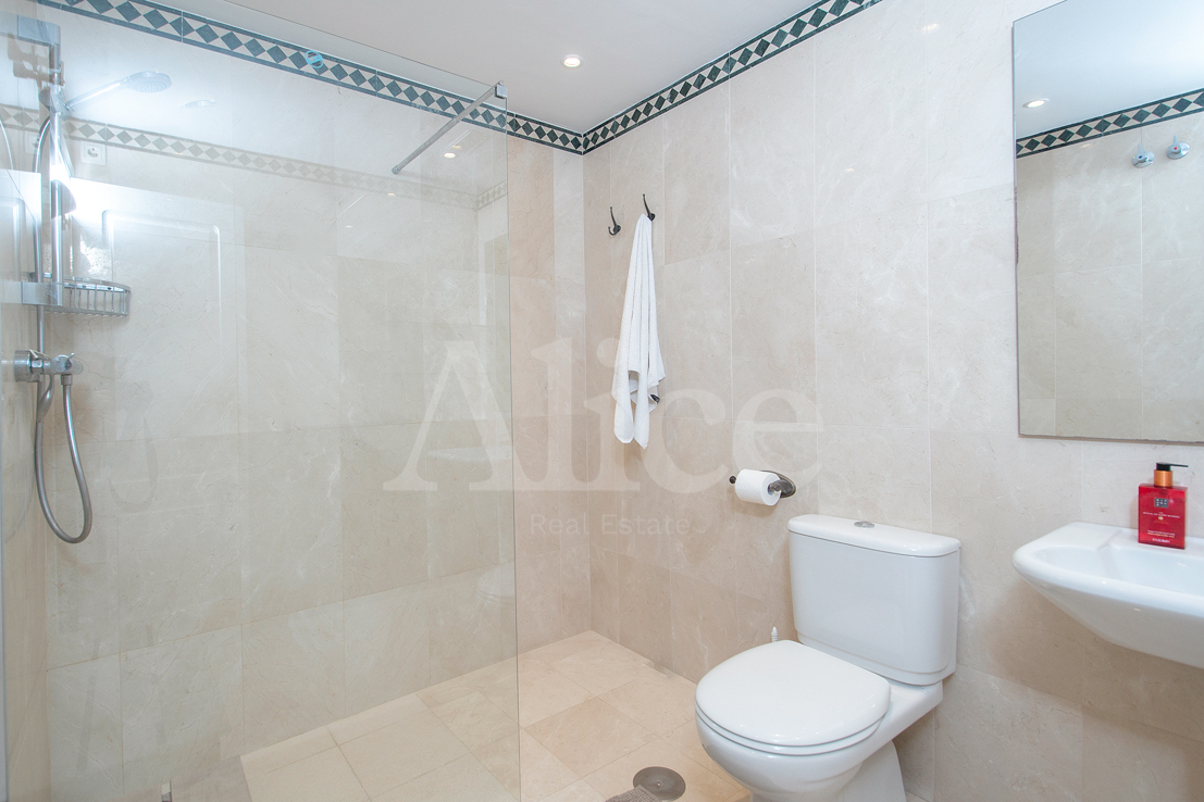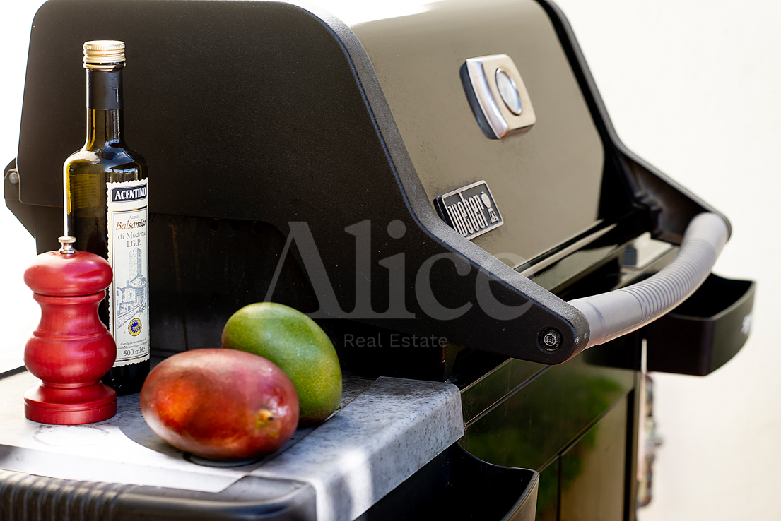 На нижнем этаже вы найдете гостиную и большую кухню с открытой планировкой и выходом на большую террасу с местом для гостиной, столовой и т. д. На этом этаже также находится главная спальня со смежной ванной комнатой типа «suite», с двойными дверями, выходящими на террасу с видом на море, которое вы будете видеть прямо не вставая с кровати.