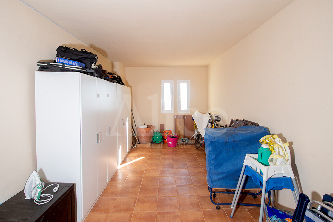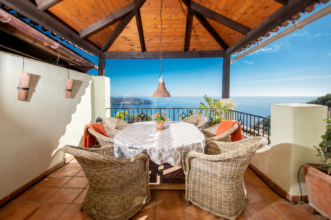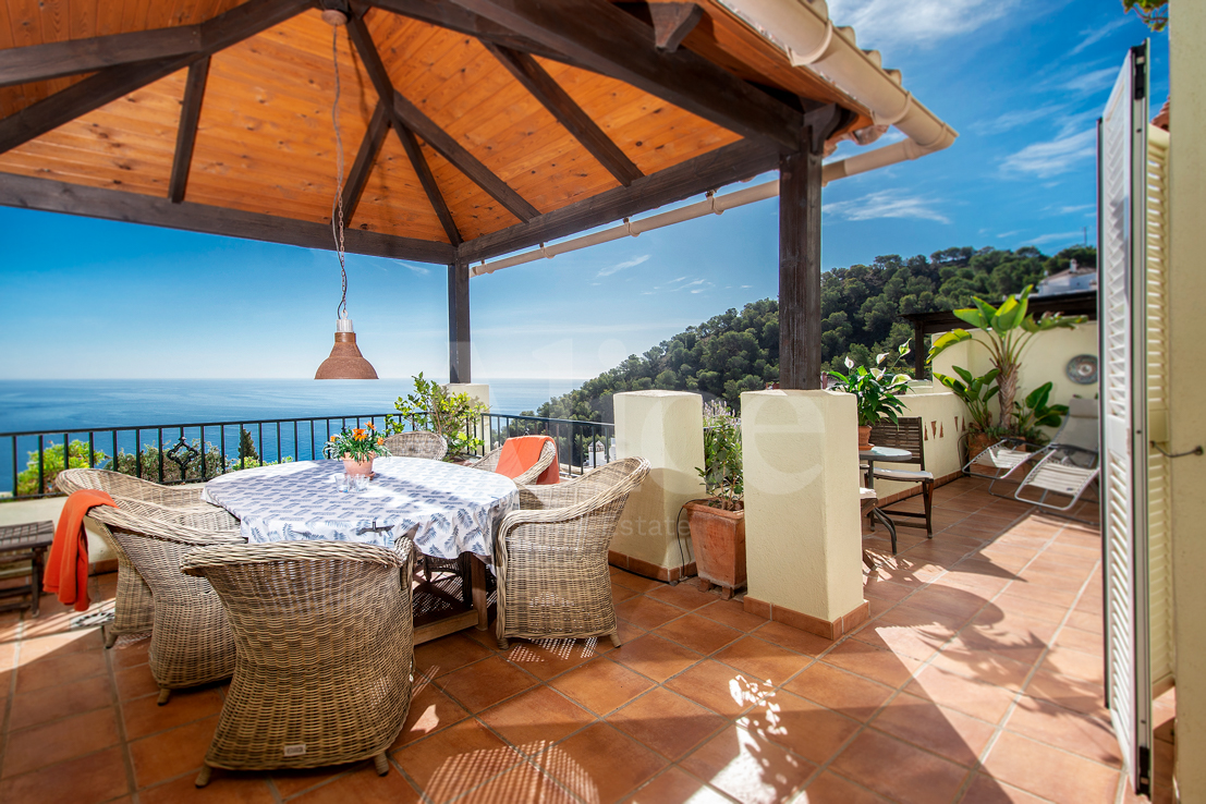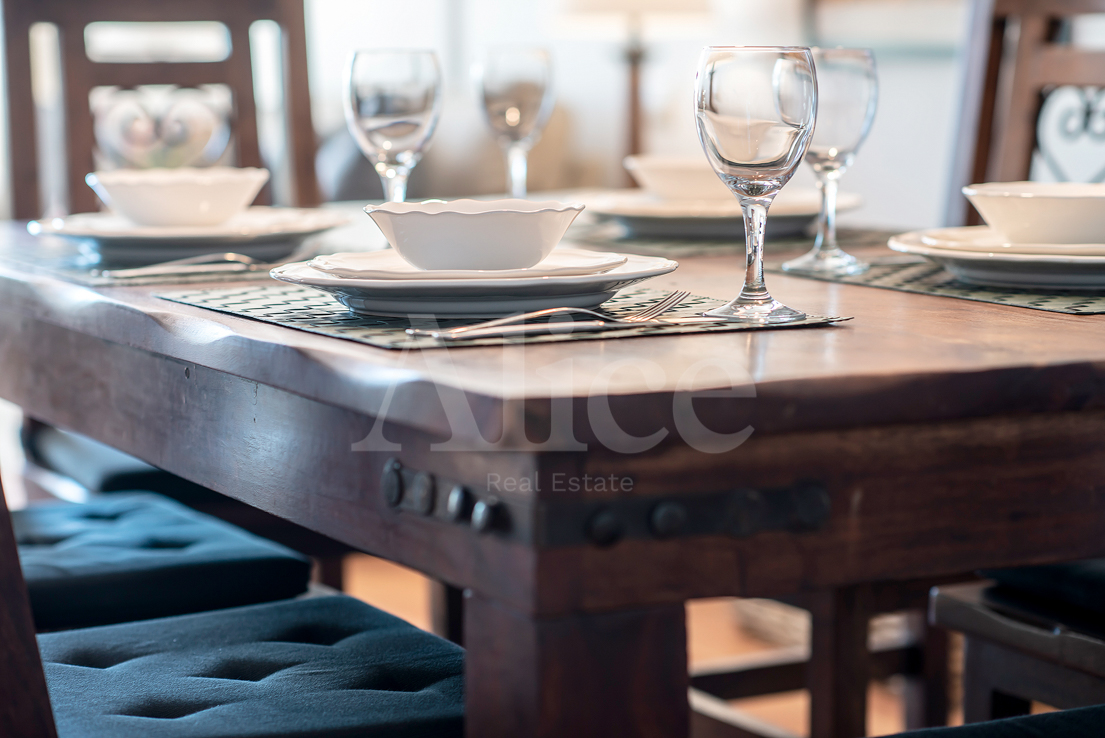 На нижнем этаже вы найдете гостиную и большую кухню с открытой планировкой и выходом на большую террасу с местом для гостиной, столовой и т. д. На этом этаже также находится главная спальня со смежной ванной комнатой типа «suite», с двойными дверями, выходящими на террасу с видом на море, которое вы будете видеть прямо не вставая с кровати.